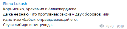 "Корниенко, Арахамия и Аллахвердиева. Даже не знаю, что противнее: сексизм двух боровов или идиотизм "бабы", оправдывающий его. Слуги либидо и пищевода", - прокомментировала она.