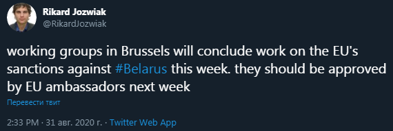 "Рабочие группы в Брюсселе завершат работу над санкциями ЕС против Беларуси на этой неделе. Они должны быть одобрены послами ЕС на следующей неделе", - написал журналист.