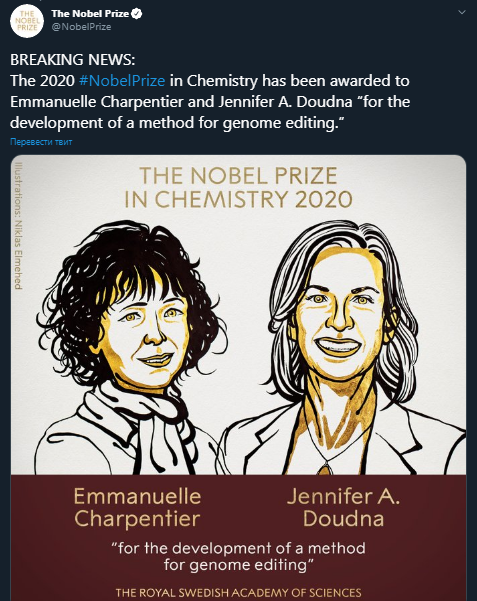 В 2020 году лауреатами Нобелевской премии в области химии стали Эммануэль Шарпентье и Дженнифер Дудна. Награду они получили за развитие методов редактирования генома.