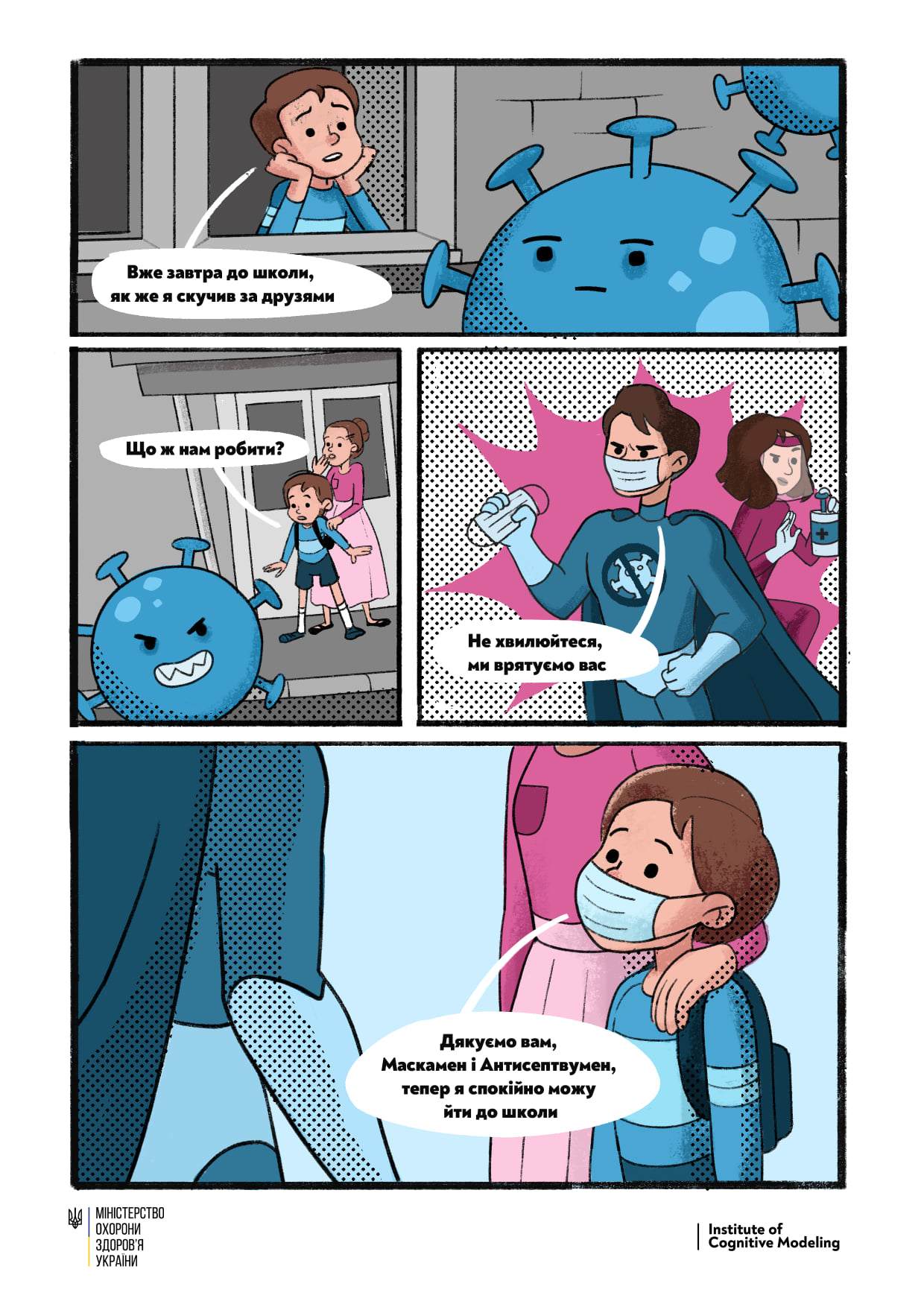 Комиксы будут отправлены в украинские школы и распространены в соцсетях. Главными героями стали cупергерои Маскамен и Антисептвумен.