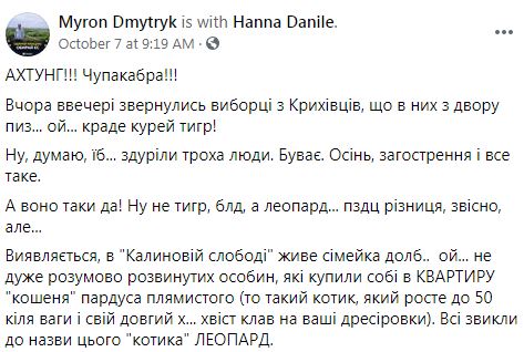 Об этом рассказывает юрист в соцсети Facebook, к которому и обратились жители. Они сообщили, что видят во дворах пятнистую пантеру, которую выгуливают их соседи. Иногда хозяева выгуливают ее даже без поводка.