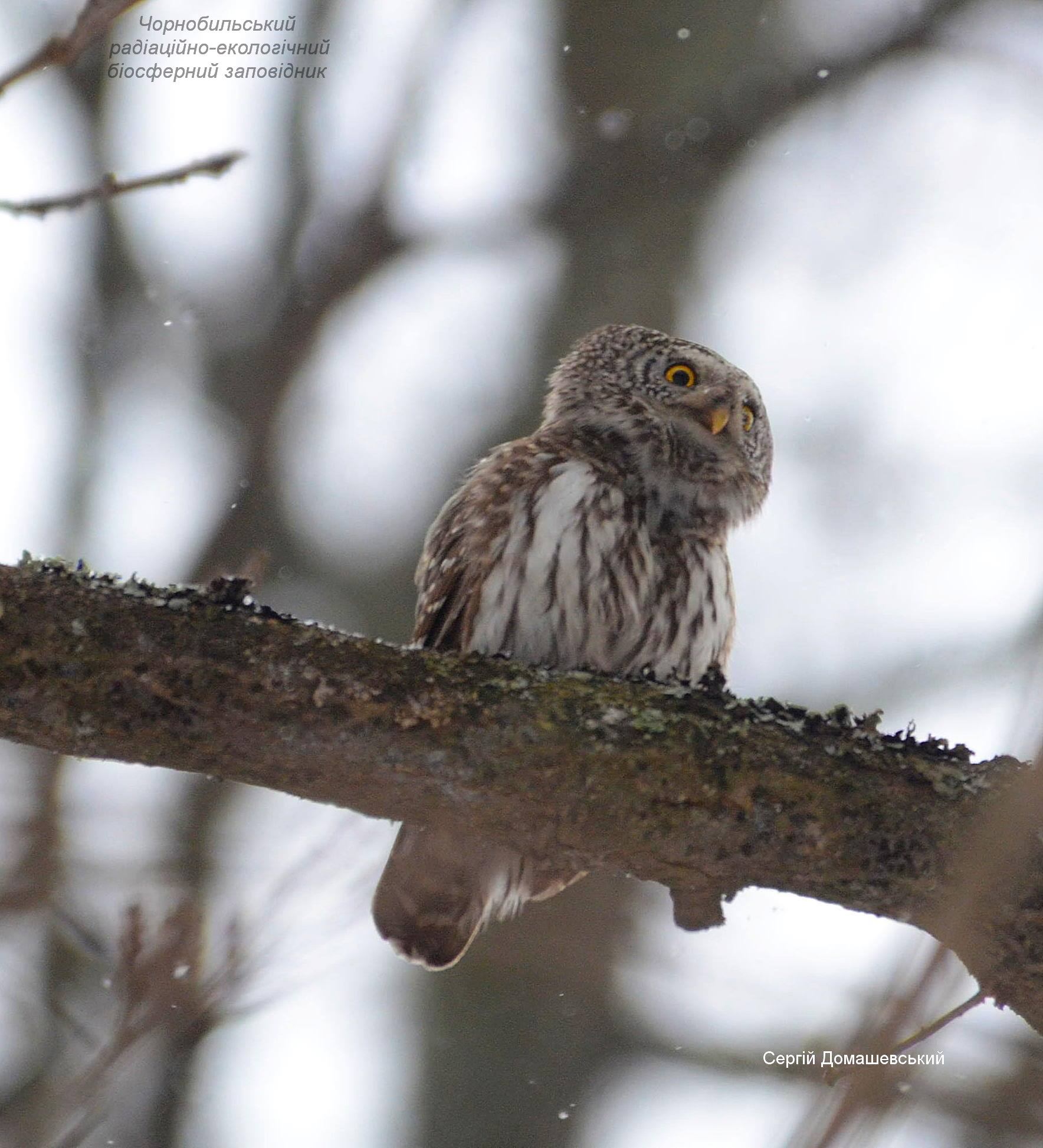 "Сычик воробьиный (Glaucidium passerinum) - самая маленькая сова в Украине. Обитает в лесной зоне. Вес птицы едва достигает 80 грамм. Это бореальный (северный) вид. Нам известно 18 мест пребывания рябинового сычика в Чернобыльском заповеднике. Их численность здесь может достигать, по меньшей мере, 40 пар. Сычик является оседлым, но молодые птицы откочёвывают на юг. В отличие от многих видов сов, он охотится с утра до вечерних сумерек", - указано в сообщении.