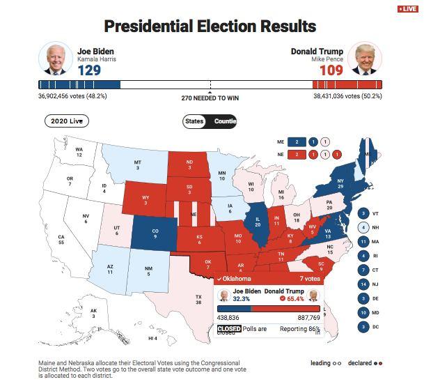 Согласно информации телеканала Fox, за действующего главу Белого дома проголосовали 50,2% или 38,4 миллиона избирателей. За его соперника от Демократической партии Джо Байдена - 48,2% или 36,9 миллионов.