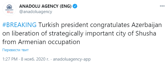 "Освобождение Шуша - символ скорейшего освобождения оставшихся оккупированных земель Азербайджана. От своего имени, членов своей семьи и всего народа Турции поздравляю собратьев с этой значимой победой", - сказал Эрдоган.