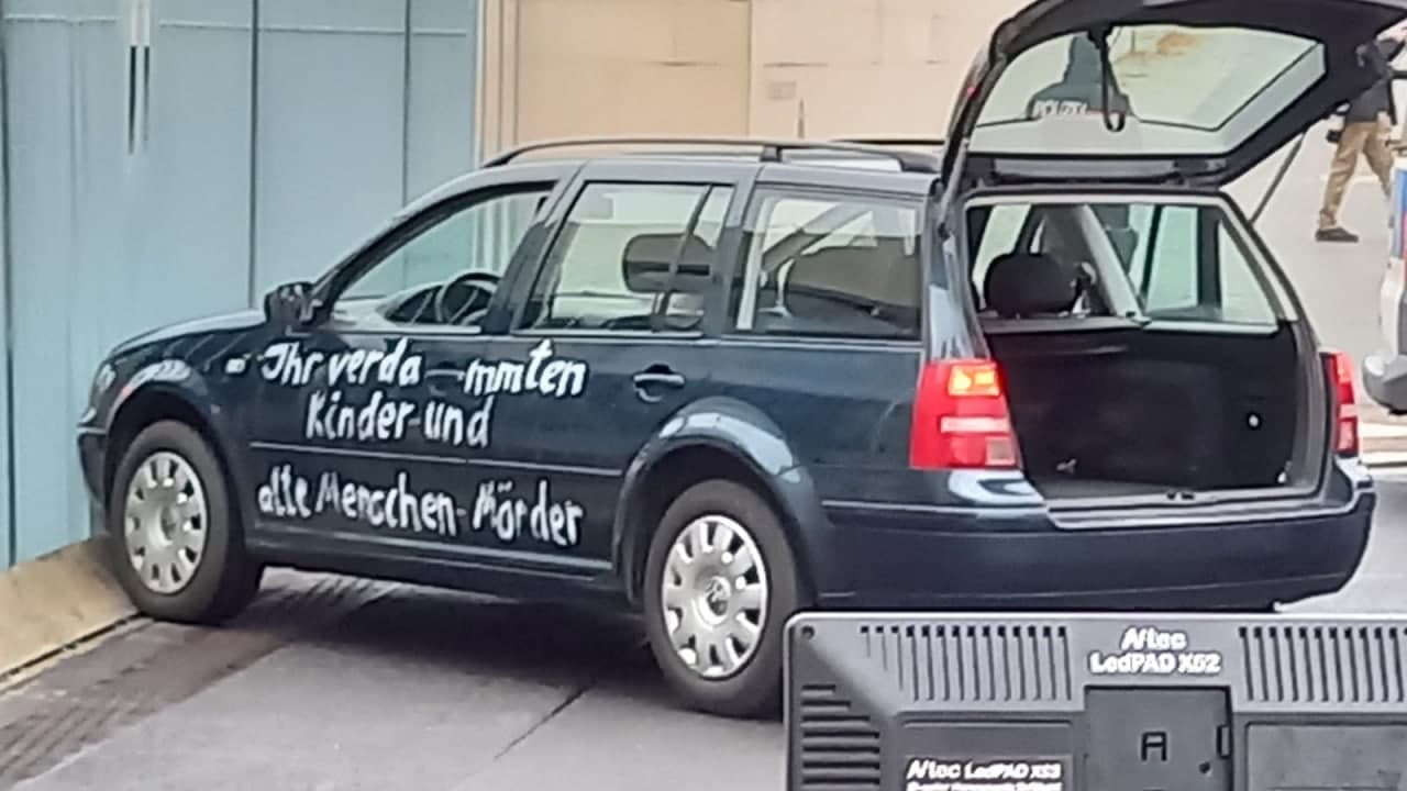 Неизвестный на машине с надписью "проклятые убийцы детей и стариков" въехал в ворота офиса Меркель. Фото