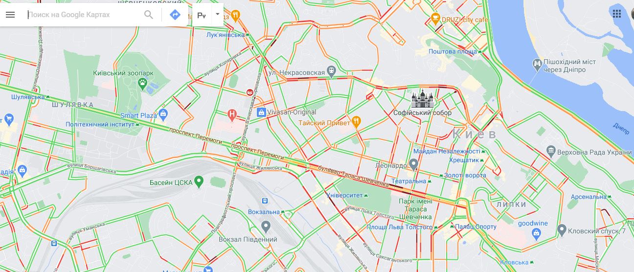 15:55 Такая ситуация сейчас на дорогах столицы. Основная загруженность на бульваре Шевченко (у парка Шевченко и ботсада), улице Саксаганского (между улицами Петлюры и Паньковской), на Большой Житомирской (у Михайловского собора), улице Сечевых Стрельцов, на Глыбочицкой (у сквера Алиева), на улице Довженко и Телиги, в районе Выдубичей и на Борщаговке.