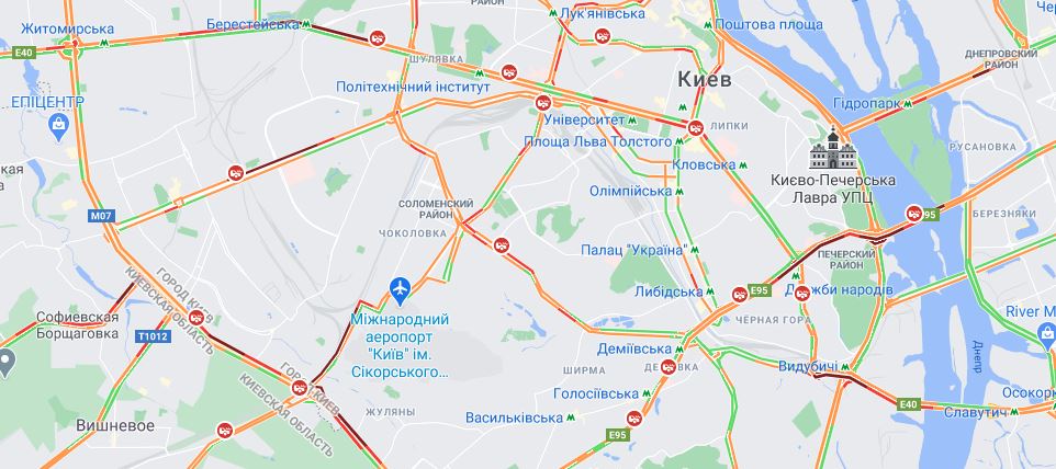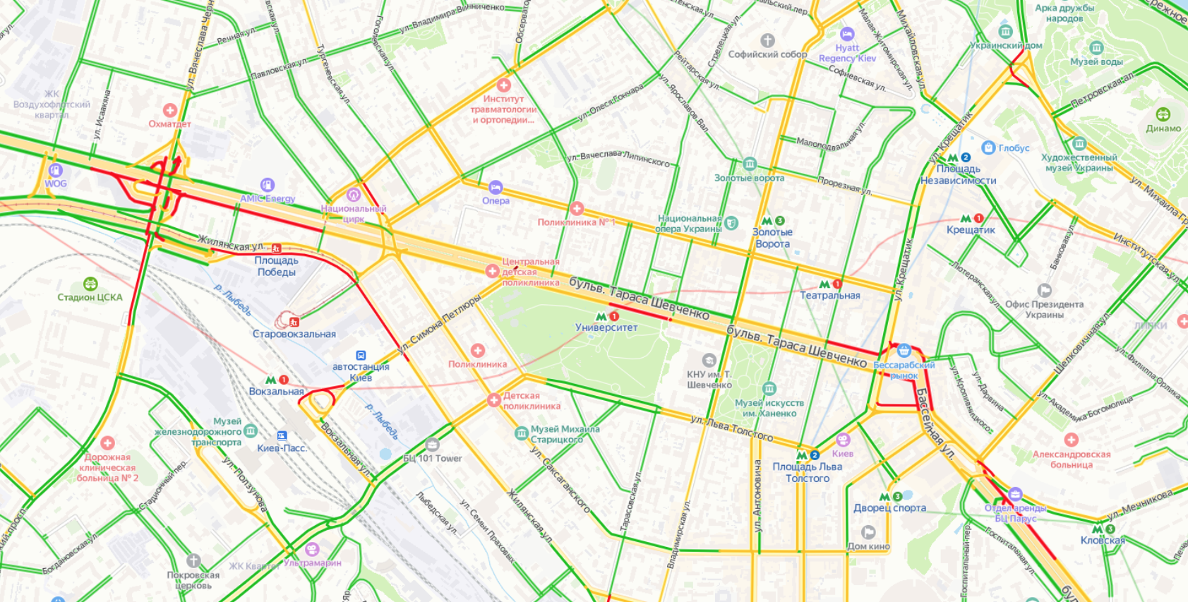 13:58 В Киеве покраснели Вокзальная площадь, Тараса Шевченко, Бассейная, Жилянская, Антоновича.