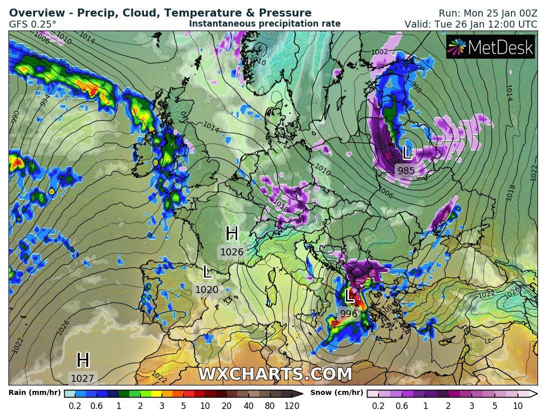 По словам Диденко, ближайшей ночью из-за циклона дожди и снег охватят большинство областей Украины. 26 января днем циклон сдвинется на север, и поэтому осадки останутся только в северной части страны. Также дождь и мокрый снег затронут полосу от Одесской через Черкасскую, Днепропетровскую и до Харьковской области. Ветер в Украине с юго-восточного сменится на юго-западный, будет порывистым, до сильного.