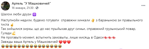 "А добрі деееееень Сьогодні розпочинаемо размовний ци(ы)рк. Будемо балакать на украйонській молві. Нагадую, надягайте маски, не намагайтесь пролизты в приміщення кав'ярні. Будьте адекватні на скільки це можливо. Дяяяяякуемо".