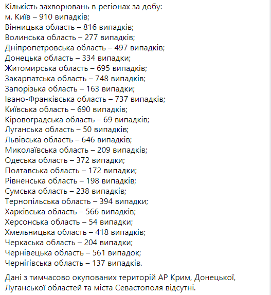 За последние сутки наибольшее количество подтвержденных случаев зарегистрировано в Киеве (910), Винницкой (816), Закарпатской (748), Ивано-Франковской (737) и Житомирской (695) областях.