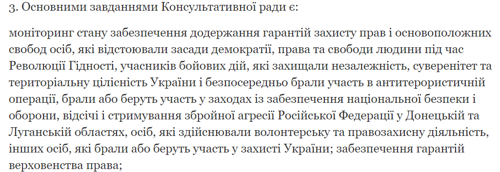 Если раньше он назывался "Консультативный совет по вопросам обеспечения гарантий прав и основных свобод лиц, принимавших участие в защите Украины", то теперь – "по вопросам обеспечения прав и свобод защитников Украины".