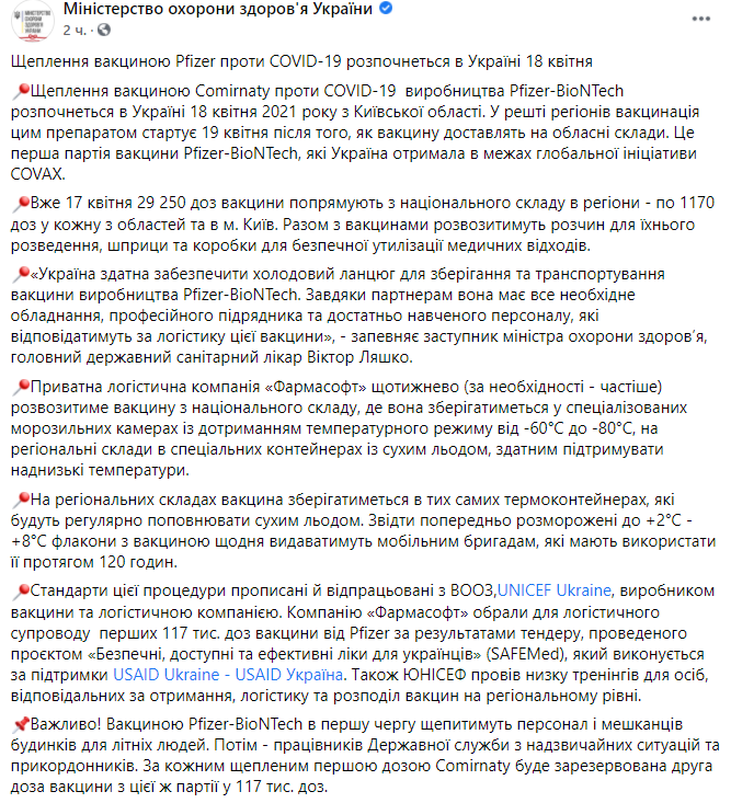 По словам замминистра здравоохранения Ляшко, Украина способна обеспечить холодовую цепь для хранения и транспортировки вакцины производства Pfizer-BioNTech.