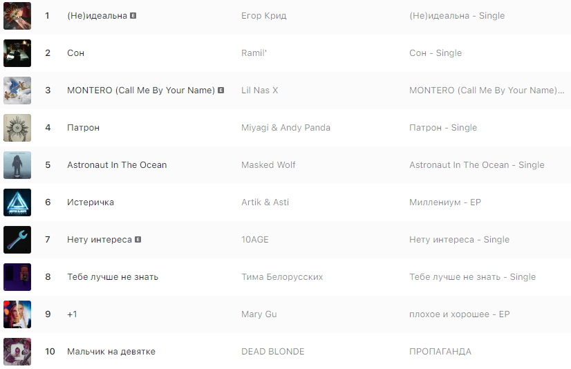 В лидерах чарта и Москвы и Киева оказались российские певцы Егор Крид с песней (Не)идеальная (в обоих рейтингах на первом месте), Ramil' - Сон (в Киеве на 4 месте, в Москве - на 2 месте), на третьей строчке обоих сити-чартов американский рэпер Lil Nas X с песней MONTERO (Call Me By Your Name). В топе также песня "Патрон" русского хип-хоп-дуэта из Владикавказа Miyagi & Andy Panda (соответственно 2 место в киевском плей-листе и 3 место - в московском).