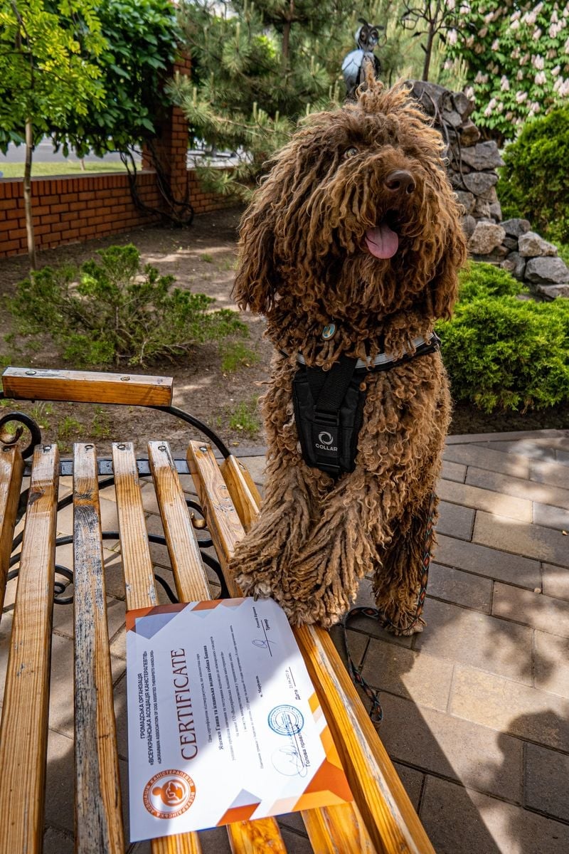 Испанская водная собака по кличке Банана вместе с психологом Госслужбы по чрезвычайным ситуациям в Донецкой области получила диплом терапевта по итогам специального обучения.