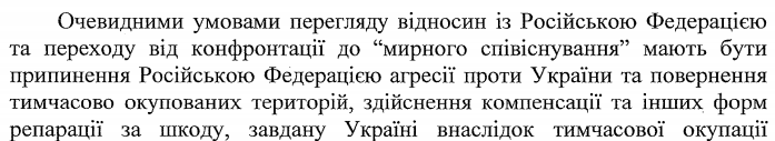 И в целом становится понятно, что нас готовят к противостоянию с Москвой на протяжении многих лет или вообще десятилетий. Так, в одном из отрывков говорится, что мира между странами не будет, пока Россия не вернет Крым, не уйдет из Донбасса, не выплатит репараций и не извинится.