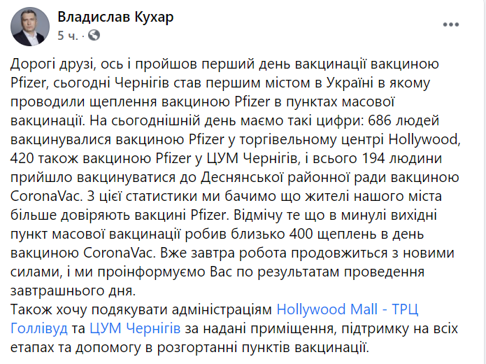 "Вот и прошел первый день вакцинации вакциной Pfizer, сегодня Чернигов стал первым городом в Украине, в котором проводили прививки вакциной Pfizer в пунктах массовой вакцинации. На сегодняшний день имеем следующие цифры: 686 человек вакцинировались вакциной Pfizer в торговом центре Hollywood, 420 также вакциной Pfizer в ЦУМ Чернигова, и всего 194 человека пришло вакцинироваться вакциной CoronaVac в Деснянский райсовет, - написал он.