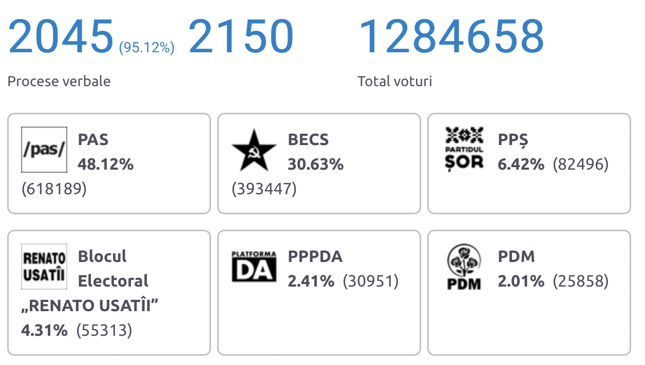 По итогам подсчета 95,12% голосов, отданных избирателями на парламентских выборах Молдовы, продолжает лидировать партия президента Майи Санду PAS. Таким образом, политическая сила сможет сформировать свое "монобольшинство".