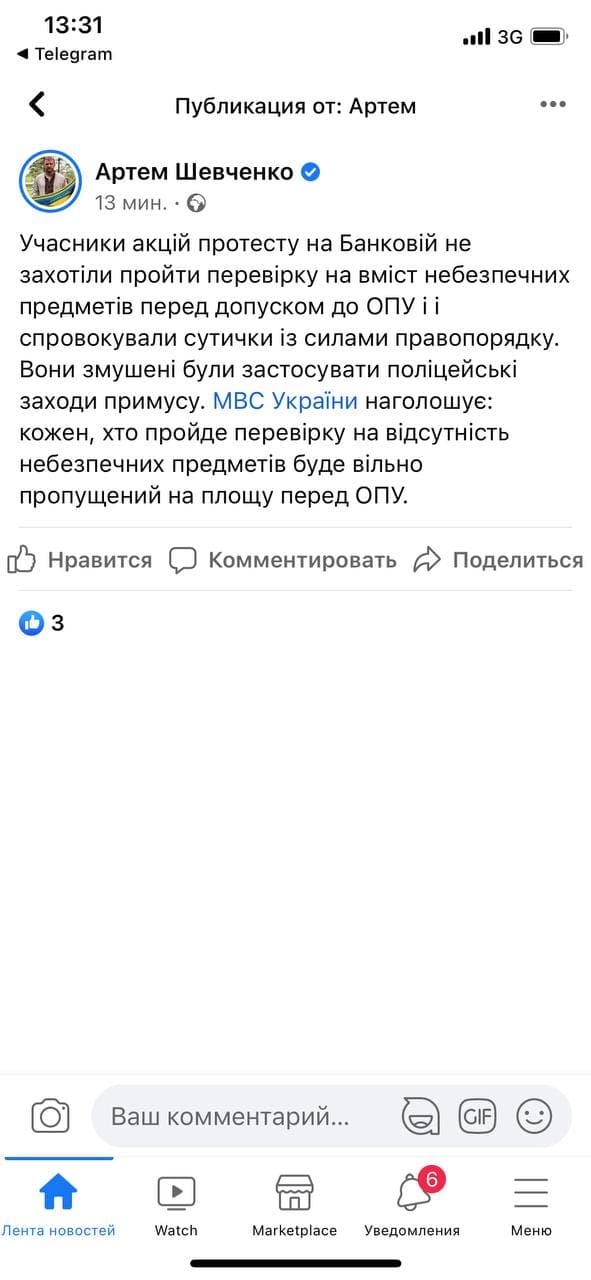 15:25 В результате столкновения под Офисом президента 7 полицейских получили ожоги глаз, несколько нацгвардийцев получили травмы, сообщил в Facebook директор департамента коммуникаций МВД Артем Шевченко.