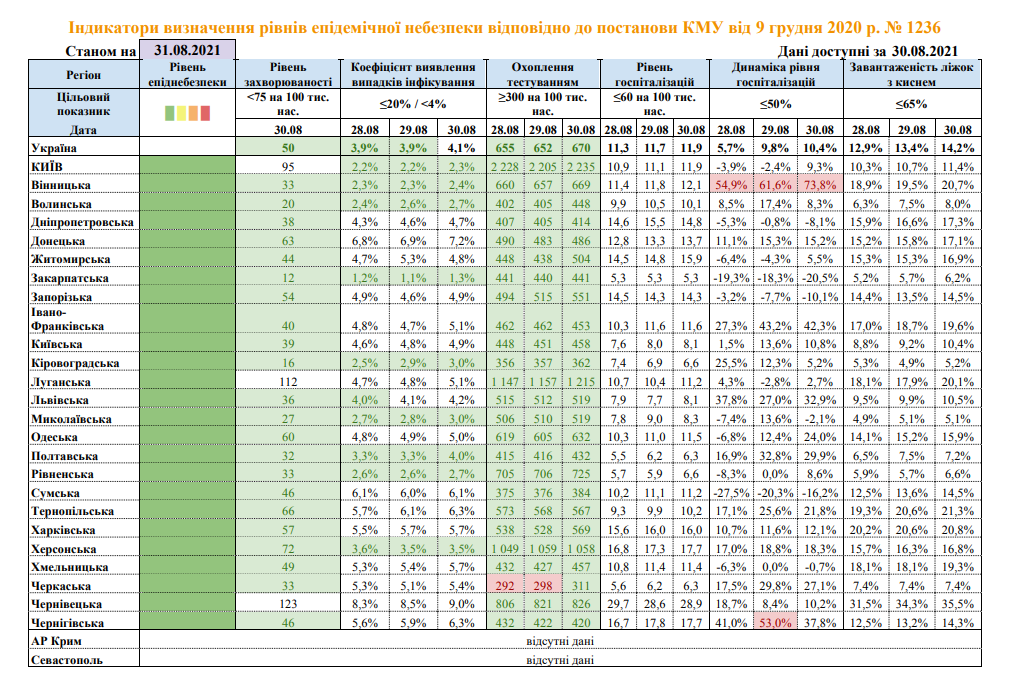 По состоянию на 31 августа все области Украины по-прежнему находятся в "зеленой" зоне карантина. В Винницкой области превышен один из коронавирусных показателей. А в Черниговской и Черкасской, где еще вчера также не все индикаторы были в норме, ситуация выровнялась.