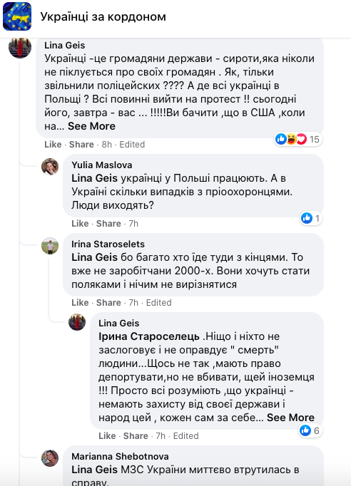 "Украинцы - это сироты, государство не заботится о своих гражданах. Как так - только уволили полицейских? А где все украинцы в Польше? Все должны выйти на протест! Сегодня его - завтра вас! Вы видели, как в США, когда наркомана, криминала, который умер не от пыток, а от передозировки, и его прижал полицейский, после чего он задохнулся, но поднялись все. Еще и подняли в каждой стране своих. А что украинцы? Проглотят как всегда? Моя хата с краю. Поэтому и нет государства и уважения других народов к украинцам, поэтому их убивают служащие, а не криминал в Португалии, Польши и т.д, и все молчат", - написала в группе "Украинцы за границей" в Facebook Лина Гейс, живущая, что характерно, в Нью-Йорке.
