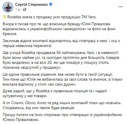 "Есть первая небольшая победа! Еще вчера Rozetka продавала 56 наименований Yaro, и в наличии они были почти все, и сегодня в течение дня большинство товаров были удалены, а на всех 20, которые еще показывает в поиске, стоит пометка "отсутствует в продаже"... А вот Сильпо, Glovo, Алло и ряд других компаний пока молчат. Надеюсь, от них также будет реакция" - написал Стерненко и призвал оставлять на их страницах комментарии и спрашивать "о сотрудничестве с украинофобкой Юлией Приваловой".