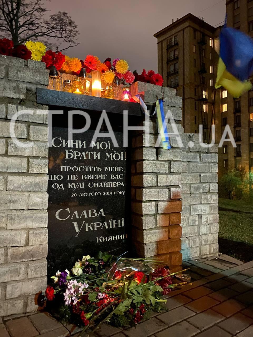 17:28 Лампадки и цветы на Институтской. Также участники ожидаемого шествия повязывают там желто-синие ленты такие, как носили участники Евромайдана восемь лет назад.