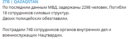 На данный момент известно о трех тысячах задержаний, восемнадцати погибших силовиках и 748 пострадавших сотрудниках органов внутренних дел и военнослужащих Нацгвардии. По информации МВД Казахстана, убито 26 участников протестов.