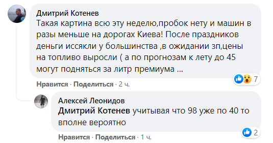 "После праздников деньги иссякли у большинства, люди в ожидании зарплат, цены на топливо выросли. А по прогнозам к лету до 45 могут подняться за литр премиума", - пишут пользователи паблика "Автомобильный Киев".