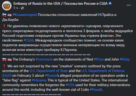 "Не удивлены появлению нового "креативного" сценария, озвученного пресс-секретарями Госдепартамента и Пентагона 3 февраля, о якобы ведущейся Россией подготовке операции против Украины под "чужим флагом". Это свойственно США. Международное сообщество помнит, на основе каких подлогов американцы осуществляли военные интервенции по всему миру, включая всем известную пробирку Колина Пауэлла", - заявили в посольстве.