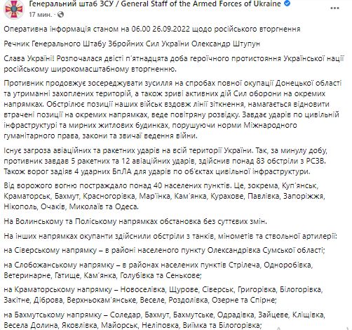 В понедельник, 26 сентября, идет 215-й день полномасштабного российского вторжения в Украину.