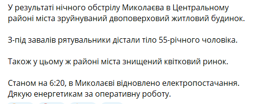 Сенкевич уточнил, что по состоянию на 06:20 в Николаеве было возобновлено электроснабжение.