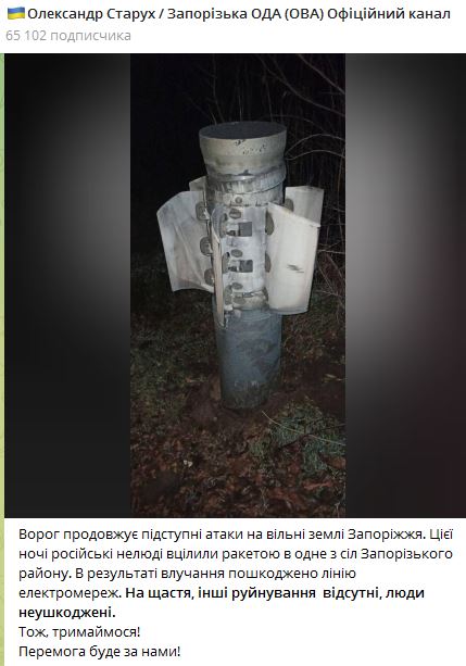 07.45 Этой ночью под обстрел РФ попало одно из сел Запорожского района. В результате была повреждена линия электросетей. Обошлось без пострадавших.