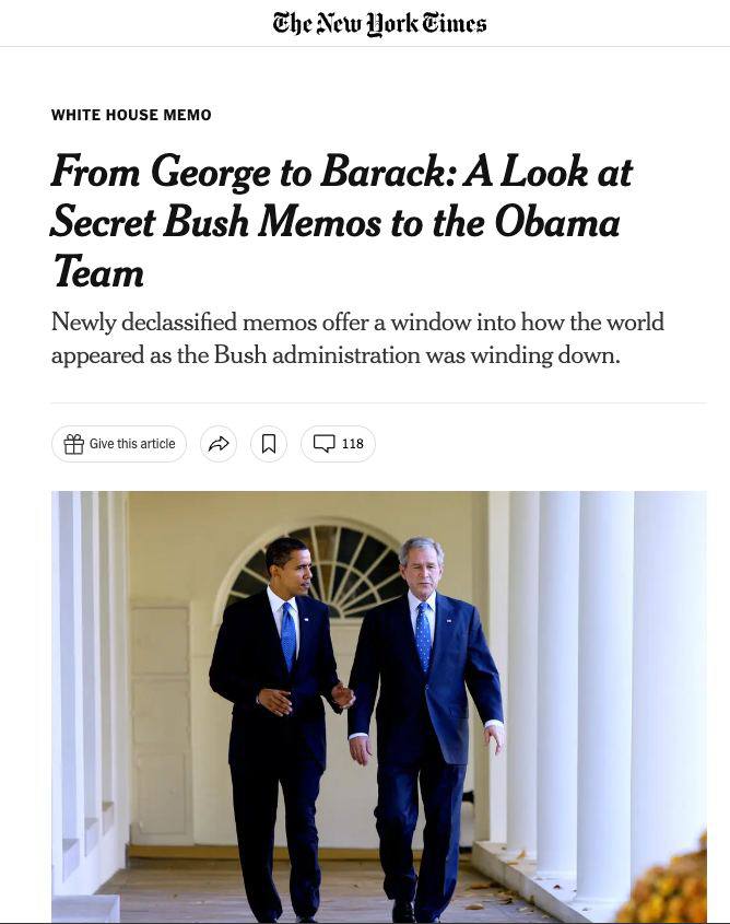 The New York Times опубликовала рассекреченные документы, переданные в 2009 году уходящим с поста президента Джорджем Бушем своему преемнику - Бараку Обаме. Газета называет их "небольшим советом" в условиях "неспокойного" мира.
