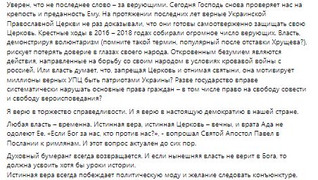 "На протяжении последних лет верные Украинской Православной Церкви не раз доказывали, что они готовы самоотверженно защищать свою Церковь. Крестные ходы в 2016 – 2018 годах собирали огромное число верующих. Власть, демонстрируя волюнтаризм (помните такой термин, популярный после отставки Хрущева?), рискует потерять доверие в глазах своего народа. Откровенным безумием являются действия, направленные на борьбу со своим народом в условиях кровавой войны с Россией. Или власть думает, что, запрещая Церковь и отнимая святыни, она мотивирует миллионы верных УПЦ быть патриотами Украины? Разве государство вправе систематически нарушать основные права граждан – в том числе право на свободу совести и свободу вероисповедания? Любая власть – временна... Духовный бумеранг всегда возвращается. И если нынешняя власть не верит в Бога, то должна усвоить хотя бы уроки истории", - пишет Новинский.