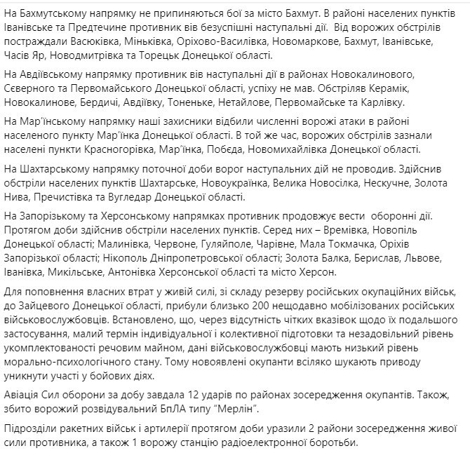 - Авиация ВСУ нанесла 12 ударов. Сбит российский разведывательный БПЛА типа "Мерлин".