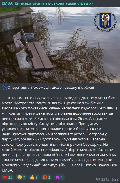 Аварийных подтоплений по Киеву нет, сохраняются подтопления на островах "Муромец", "Гидропарк", Труханове в Галерном заливе. в Корчеватом и на Осокорках.