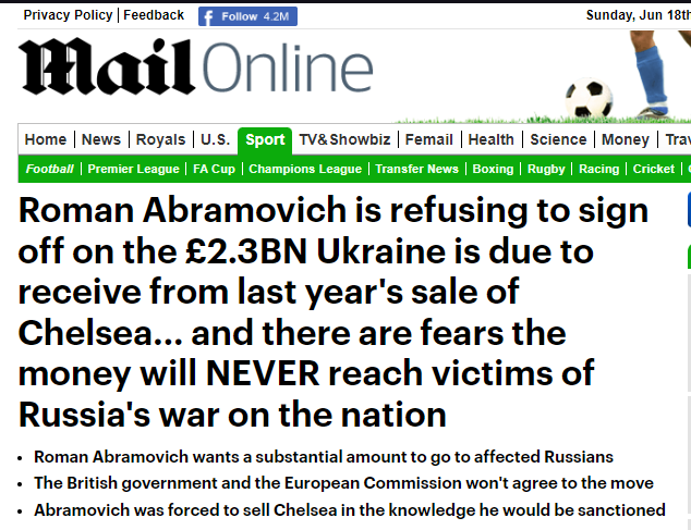 Ранее Telegraph сообщил, что британское правительство согласует передачу на помощь Украине 2,3 млрд фунтов от продажи клуба "Челси". Абрамович объявил о продаже "Челси" ещё до попадания в санкционный список. Для оформления продажи клуба Абрамовичу пришлось запрашивать разрешение у правительства Великобритании. Весной прошлого года Абрамович обещал направить вырученные деньги в фонд, созданный в пользу пострадавших в Украине.