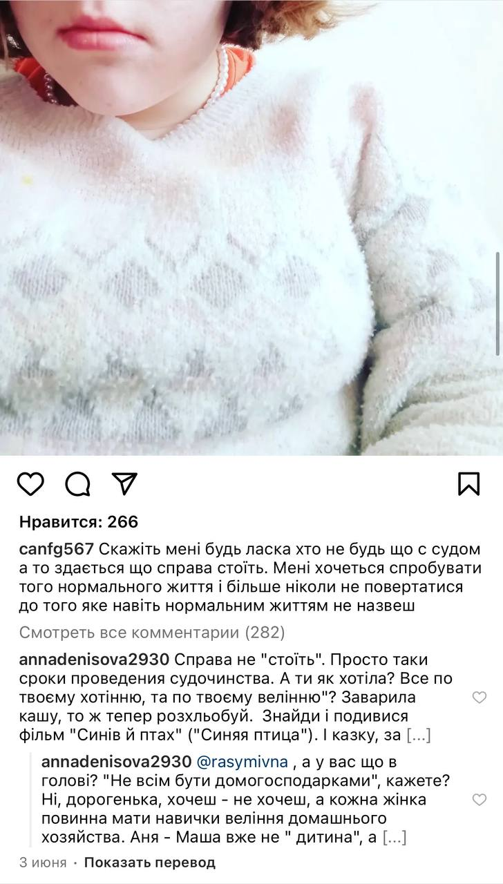 Напомним, решение исполкома об изъятии дочки было основано на просьбе самой девочки. 12-летняя Анна-Мария на своей странице в Инстаграме пожаловалась на физическое и моральное насилие со стороны матери. Как сообщил "Стране" и.о мэра Чернигова Александр Ломако, девочка "подтвердила информацию, указанную в публикации, и попросила, чтобы ее забрали от матери".