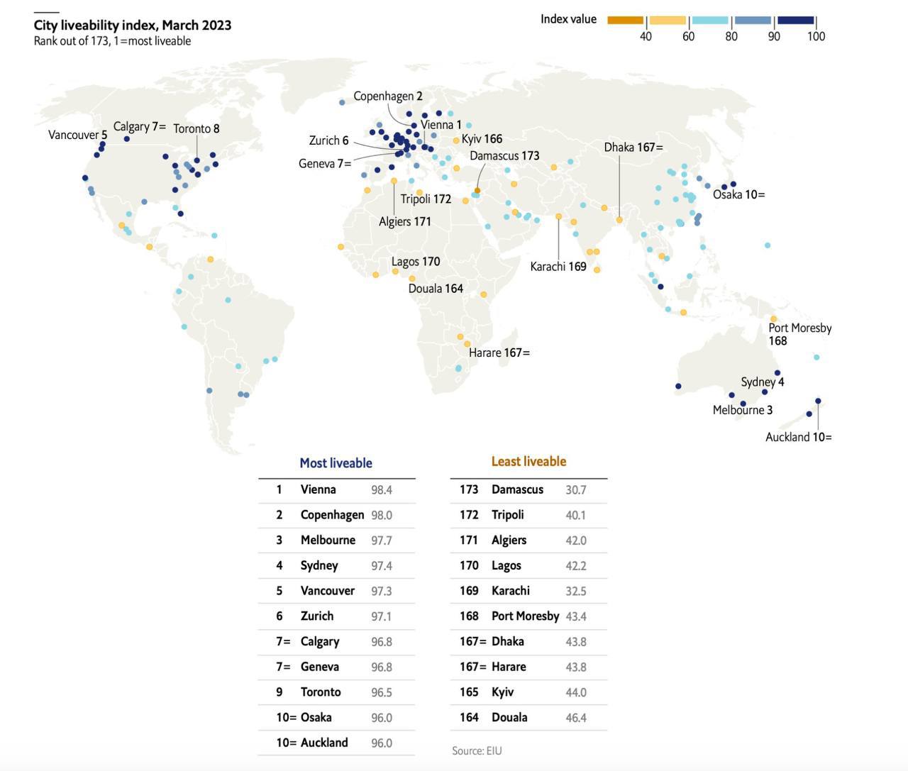 Список же самых удобных для жизни городов возглавила столица Австрии Вена. На втором месте столица Дании Копенгаген, на третьем - австралийский Мельбурн.