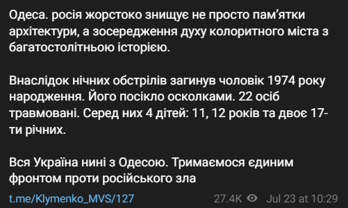Напомним, в воскресенье, 23 июля, россияне нанесли новые удары по Одессе. После ракетной атаки на Одессу есть разрушения инфраструктуры. Рано утром было известно о 19 пострадавших и об одном погибшем мирном жителе. Кроме того, частично разрушен Спасо-Преображенский кафедральный собор.