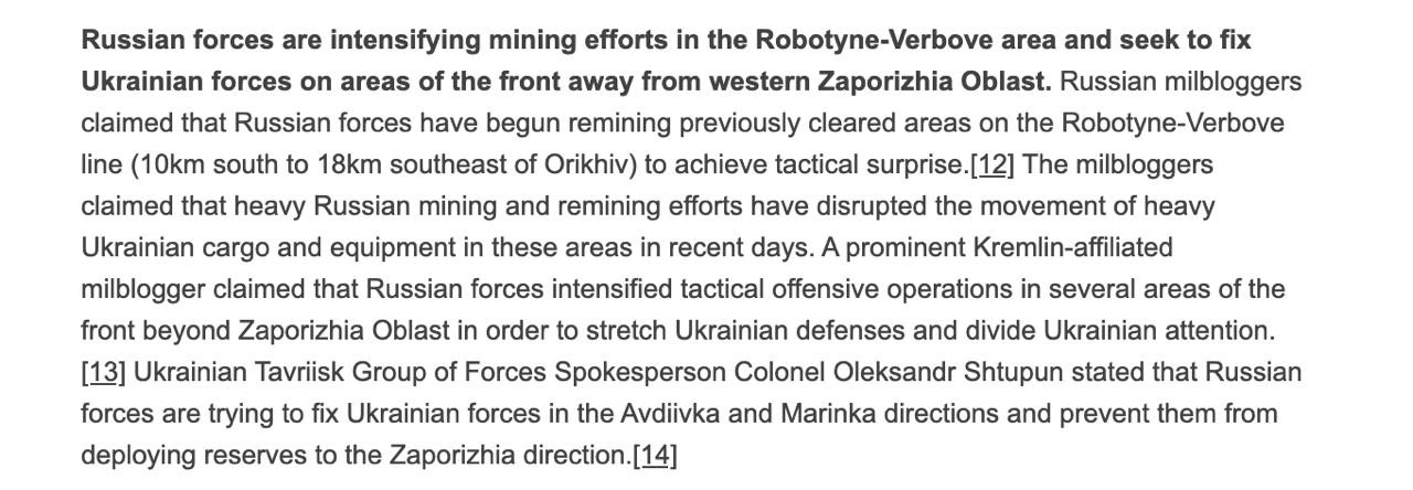 По оценке ISW, таким образом россияне стремятся сковать украинские силы на участках фронта вдали от западной части Запорожской области, а также достичь "тактической внезапности".