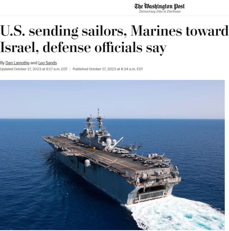 Напомним, в начале обострения на Ближнем Востоке Пентагон приказал ударной группе авианосца Gerald R. Ford отправиться в восточное Средиземноморье, чтобы продемонстрировать поддержку Израилю.