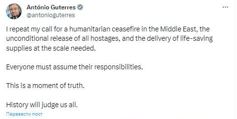 "Я повторяю свой призыв к гуманитарному прекращению огня на Ближнем Востоке, безоговорочному освобождению всех заложников и доставке жизненно важных грузов в необходимом объеме. Каждый должен взять на себя свою ответственность. Это момент истины. История нас всех рассудит", – написал Гуттериш в соцсети Х.