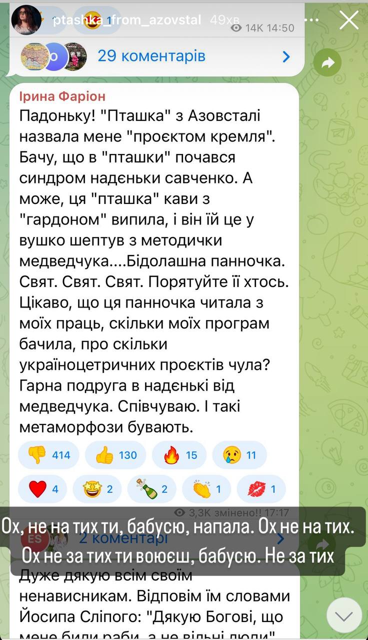 На этот пост Фарион ответила в своем телеграм-канале, заявив, что у Пташки "начался синдром Надежды Савченко".