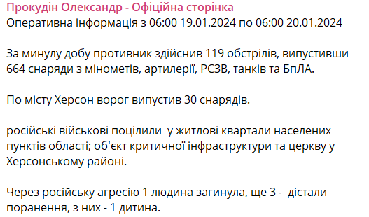 08:00 За минувшие сутки РФ совершила 119 обстрелов Херсонской области, выпустив 664 снаряда из минометов, артиллерии, РСЗО, танков и БПЛА. По городу Херсон враг выпустил 30 снарядов.