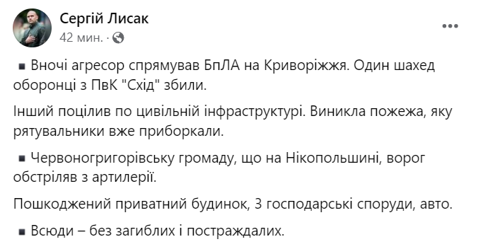 "Красногригорьевскую громаду на Никопольшине враг обстрелял из артиллерии. Поврежден частный дом, 3 хозяйственные постройки, авто", - написал Лысак.
