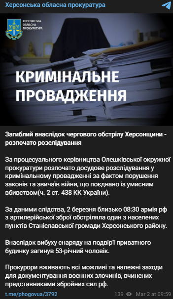 Сегодня, 2 марта, российские военные обстреляли село Станислав Херсонского района. Погиб мужчина.