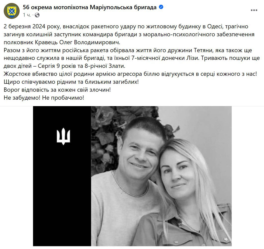 Кравец отвечал за морально-психологическое обеспечение. Его супруга Татьяна также служила в указанной бригаде.