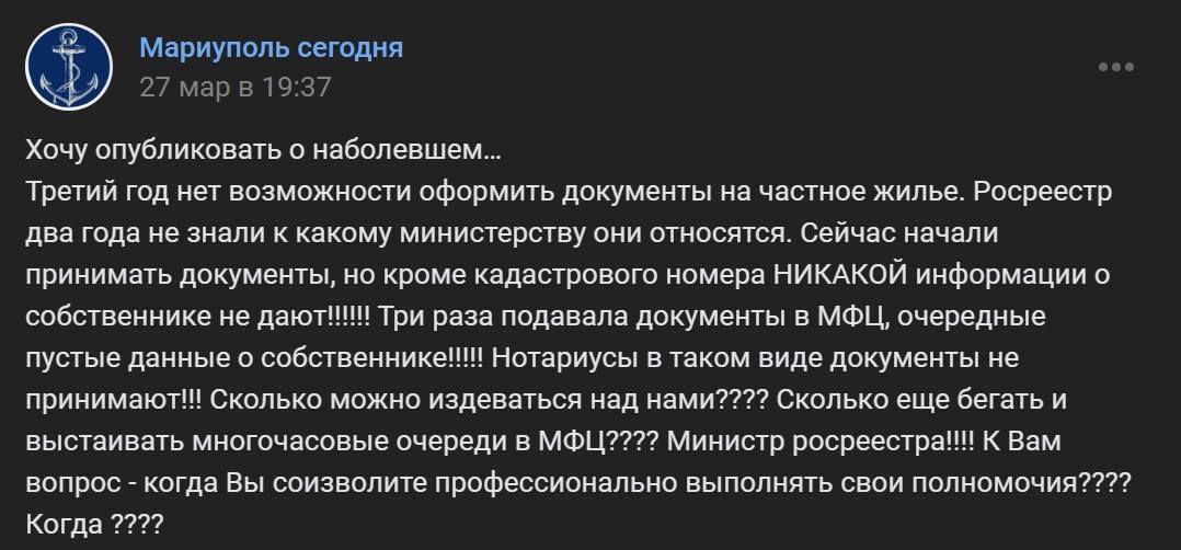 "Третий год нет возможности оформить документы на частное жилье. Росреестр два года не знали, к какому министерству они относятся. Сейчас начали принимать документы, но кроме кадастрового номера никакой информации о собственнике не дают. Три раза подавала документы в МФЦ, очередные пустые данные о собственнике. Нотариусы в таком виде документы не принимают. Сколько можно издеваться над нами? Сколько еще бегать и выстаивать многочасовые очереди в МФЦ? Министр росреестра! К Вам вопрос - когда Вы соизволите профессионально выполнять свои полномочия?" - публикует рассказ жительницы Мариуполя местный паблик.