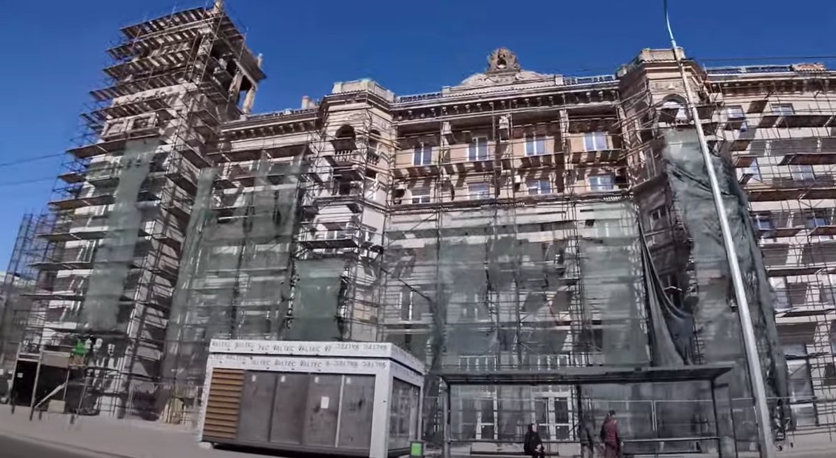 Часть домов продолжают стоять в строительных лесах или с зияющими от обстрелов дырами, в том числе, например, Центральный рынок и ДК Металлургов.